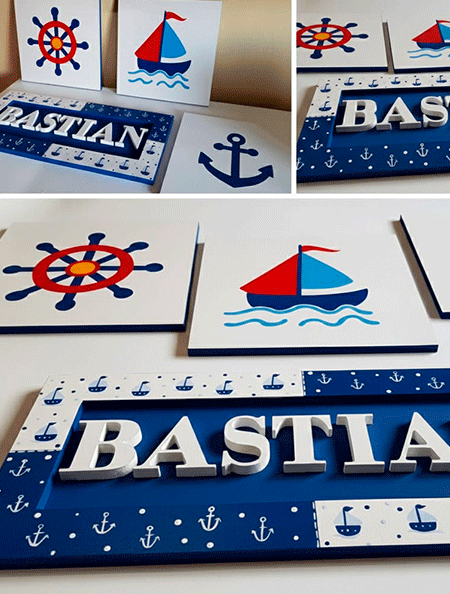 Construimos el cartel superponiendo maderas. Tanto el nombre como las figuras tienen volumen real y se destacan sobre la base.